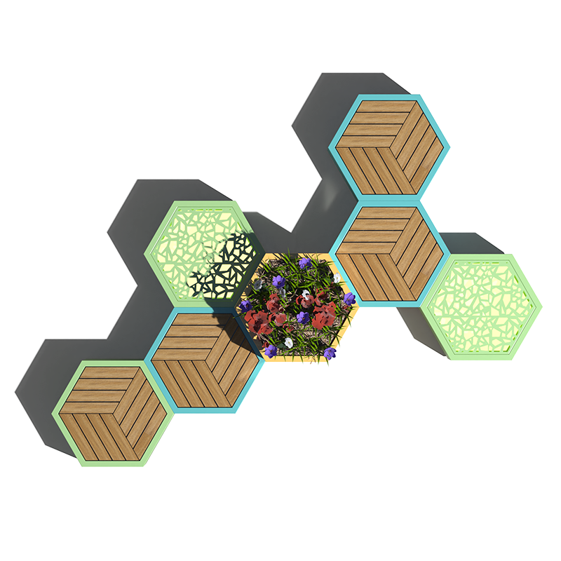 The Siap modular bench and planter range is focused around the efficient use of space both horizontally and vertically, using a modular and attractive toolkit. The modular components used are fabricated from a mixture of Aluminium sheeting and mild steel with FSC Certified Timber panels. All components can be used as free-standing elements or joined together to create a seating, planter, or mixed system. The advantage of the Siap modular bench range is that they can be stacked to create vertical units, whether for planters or tiered seating.