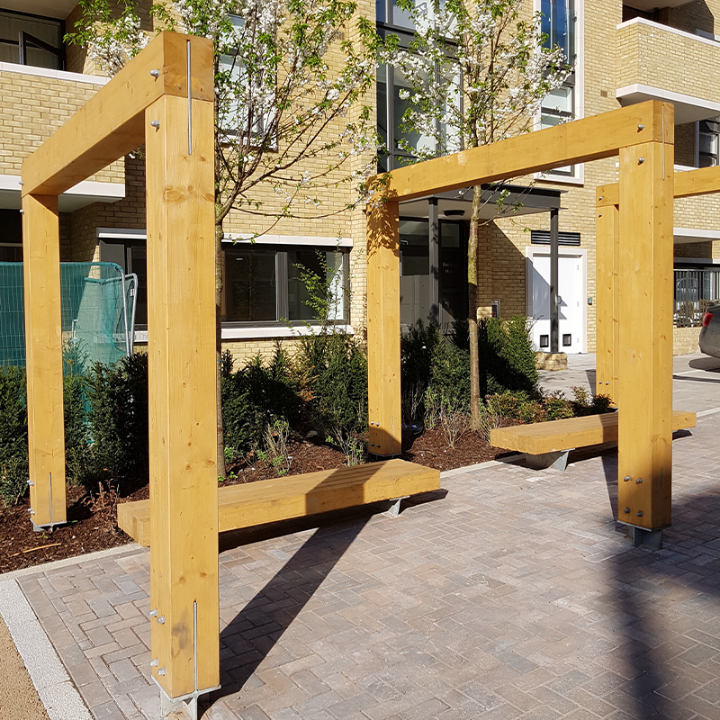 The London Road pergola is a square minimalist timber and steel arch designed to frame paths and corridors. It provides a way of accentuating routes or creating a focal point for patios and outdoor spaces while accommodating hanging and climbing plant integration. The wooden frame is raised off the ground to extend the lifespan of the timber and ensure durability in any condition. The London Road pergola is highly customisable with twelve choices of powder coating for the metalwork and five different types of responsibly sourced timber for the frame.