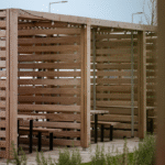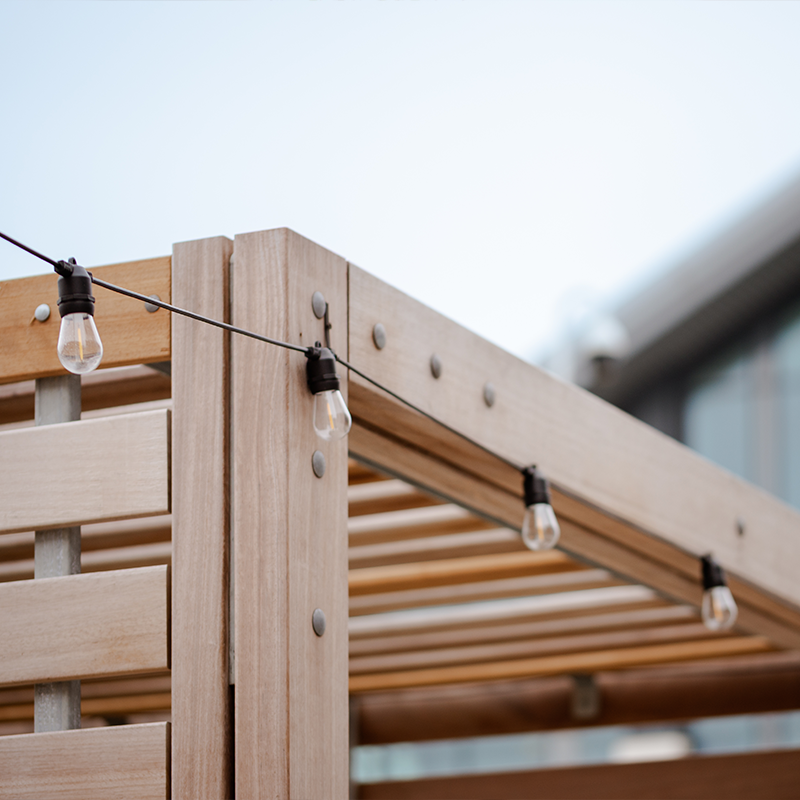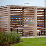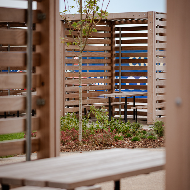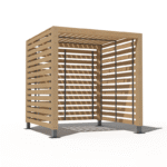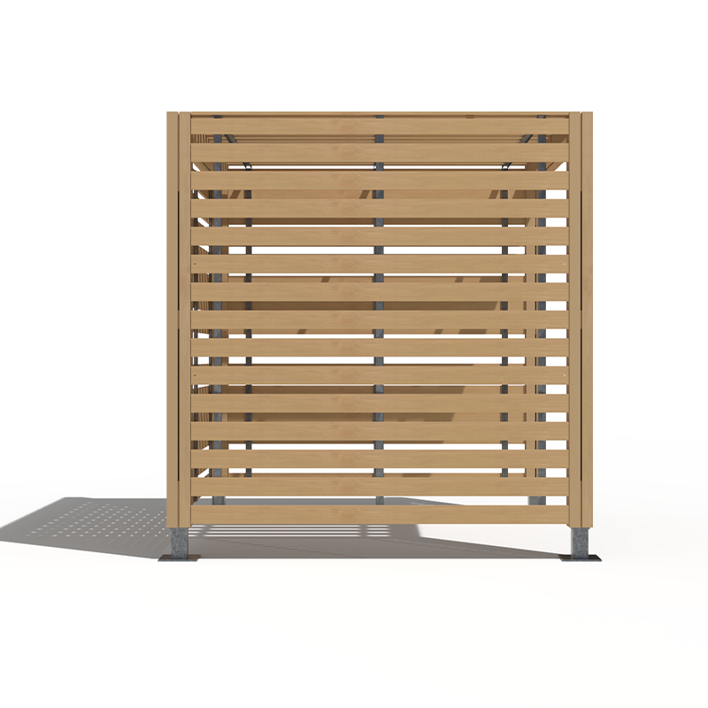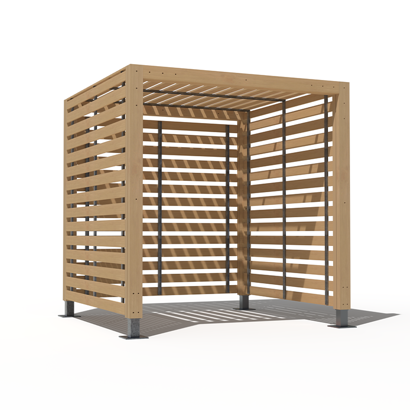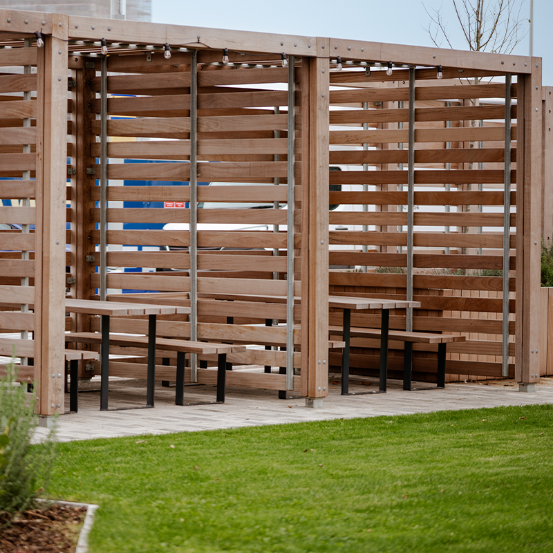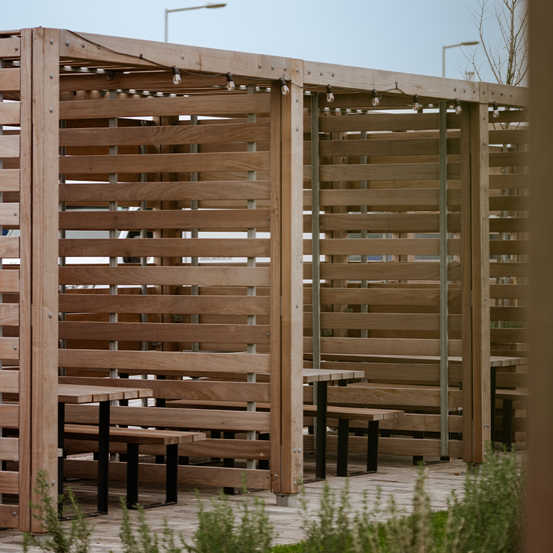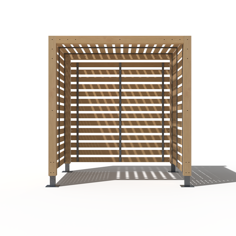 The Trinity Gardens pergola is a steel and timber cube shelter that can comfortably hold seating or a picnic bench for a secluded booth in any location. They can be used sequentially for multiple connected booths that will provide adequate shelter from the suns rays and any errant winds. The Trinity Gardens pergola can be highly customised to suit any projects aesthetic with twelve colour powder coating options and five timbers.