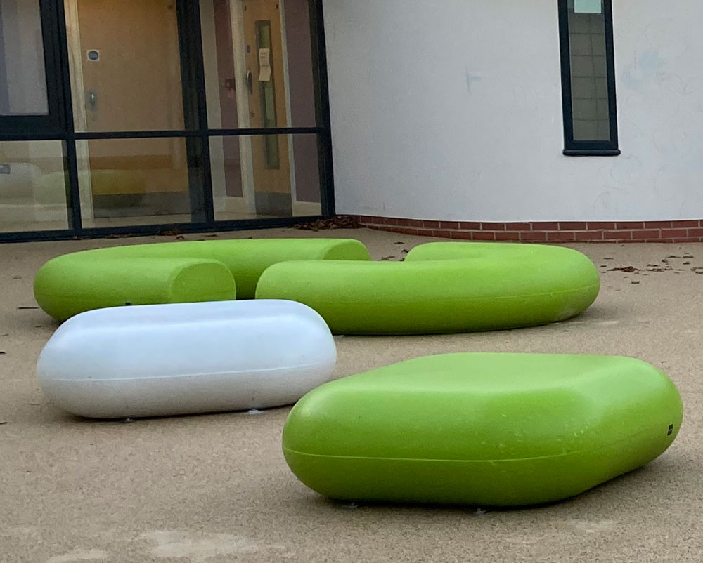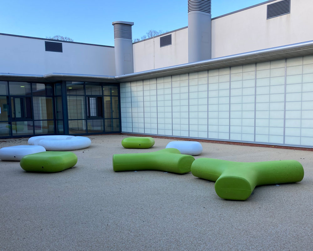Our recent installation for an NHS mental health facility for children uses elements from our Caribou and Rio ranges made from recycled plastic. The rounded seating elements without any sharp edges ensure the safety of the children and young people.