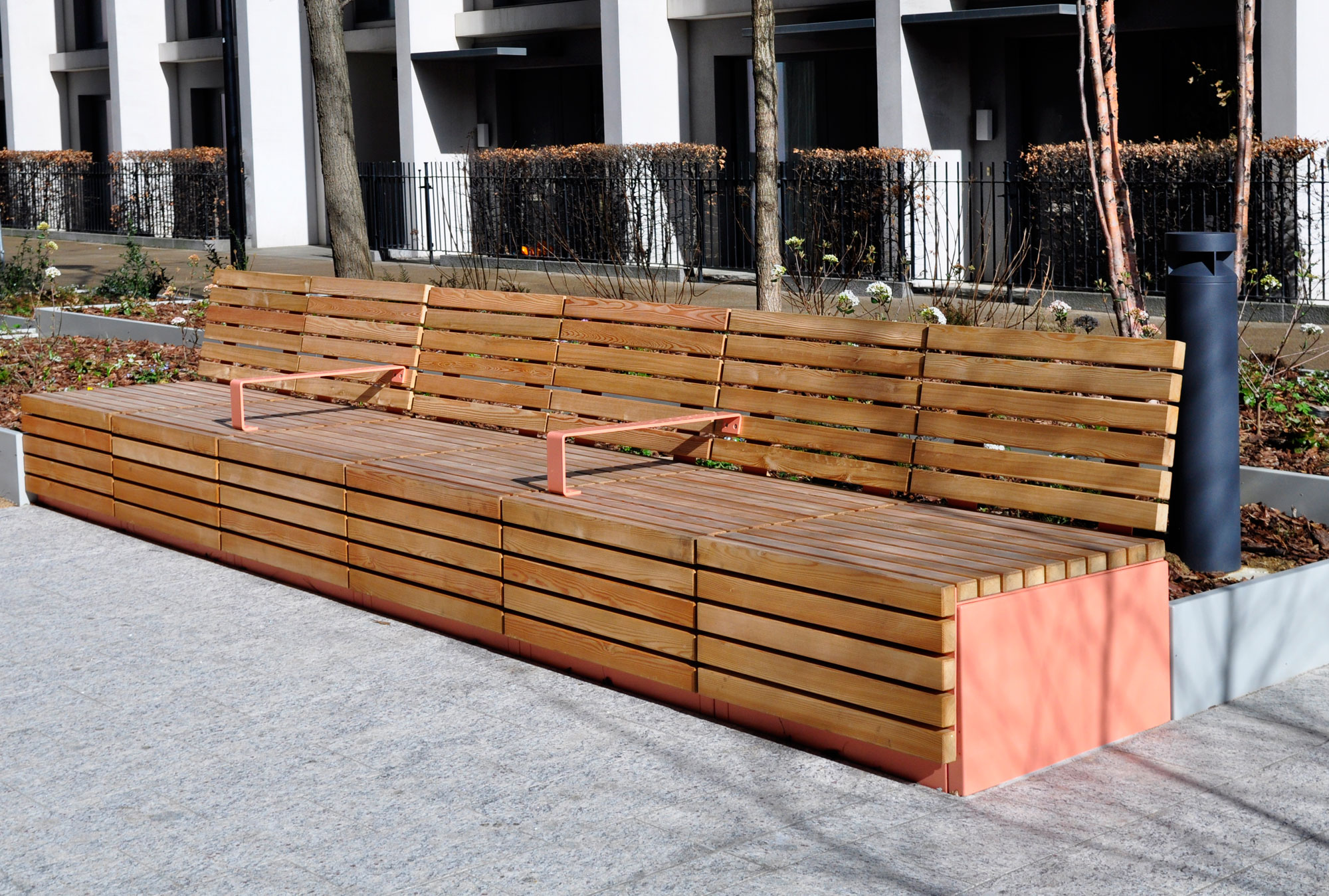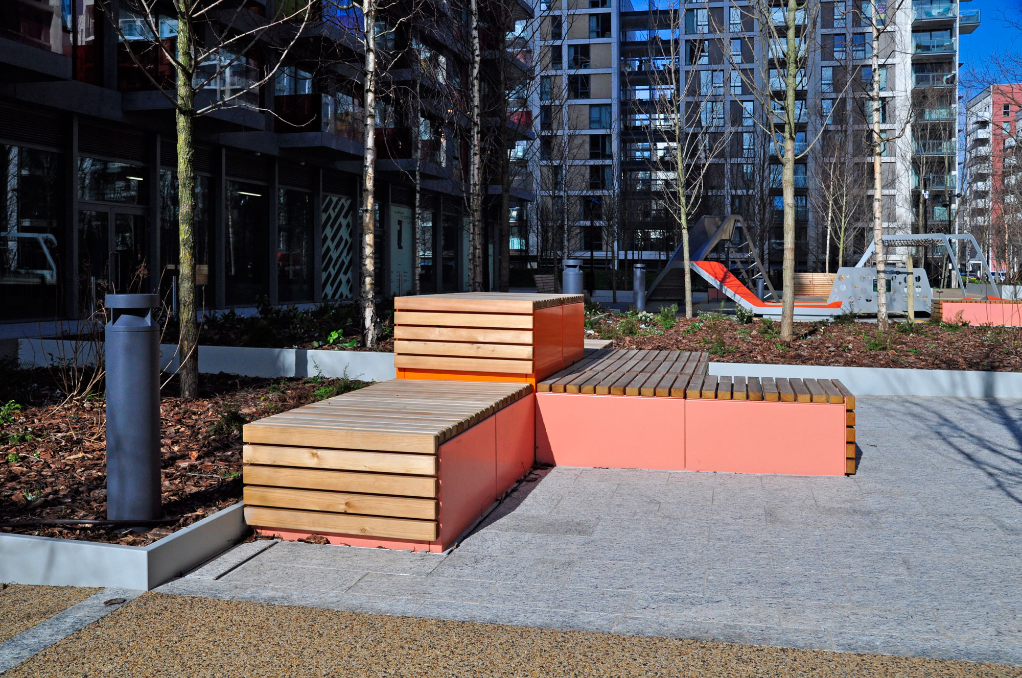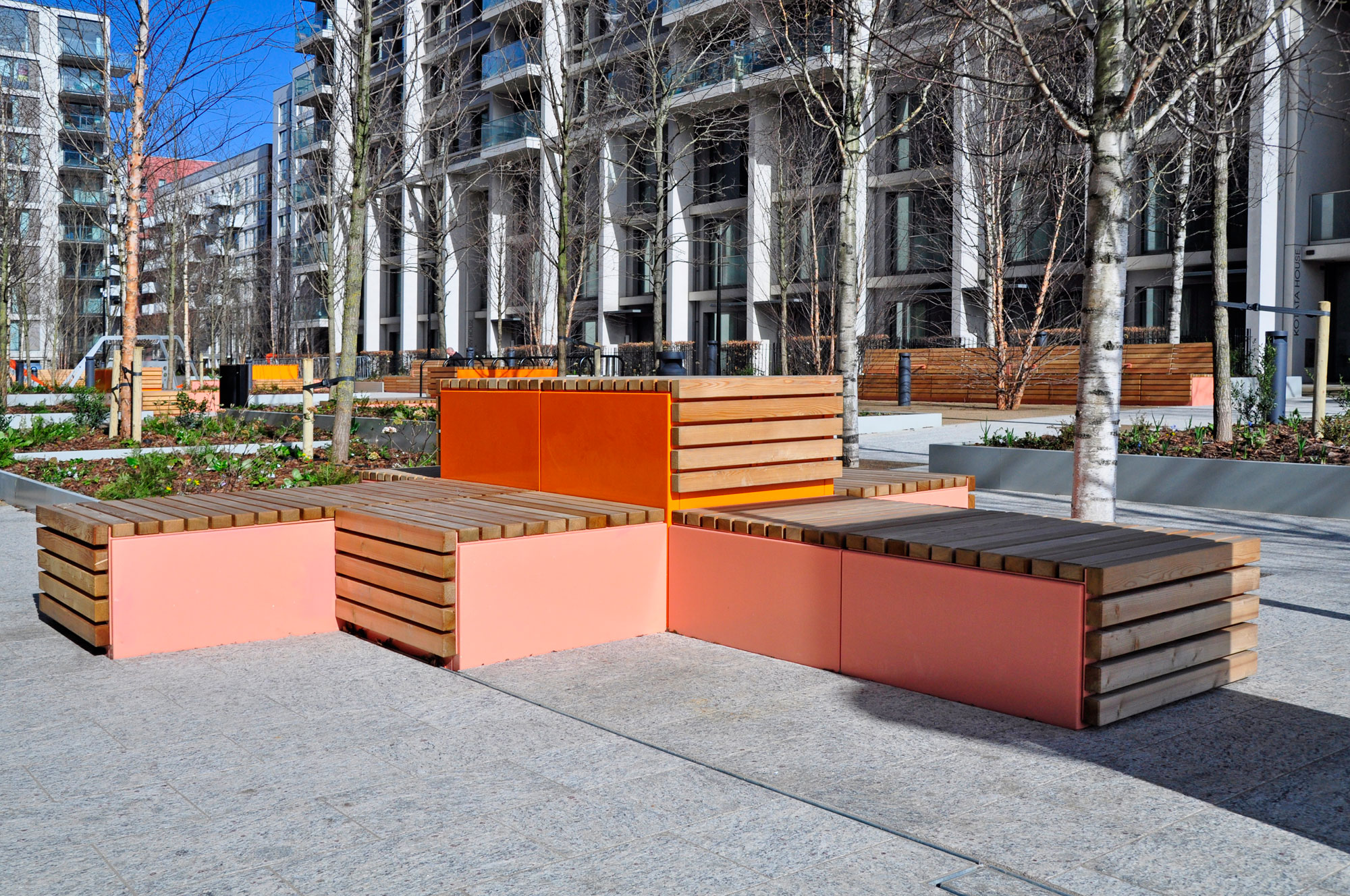 Our installation of street furniture at Ravens Walk in Stratford, London, shows just how much outdoor spaces can be transformed through creative design and the right mix of benches, planters and, in this instance, loungers and tiered seating steps. The natural warmth of the timber seats and colourful steel frames create a vibrant and inviting space to sit, relax, and watch the world go by.