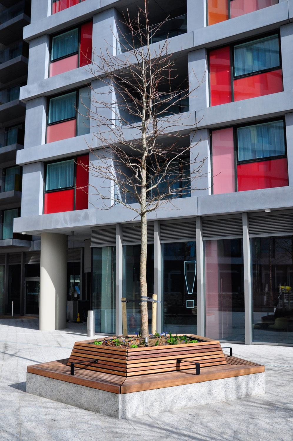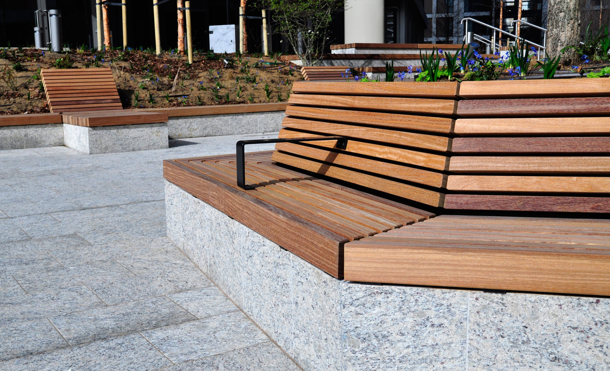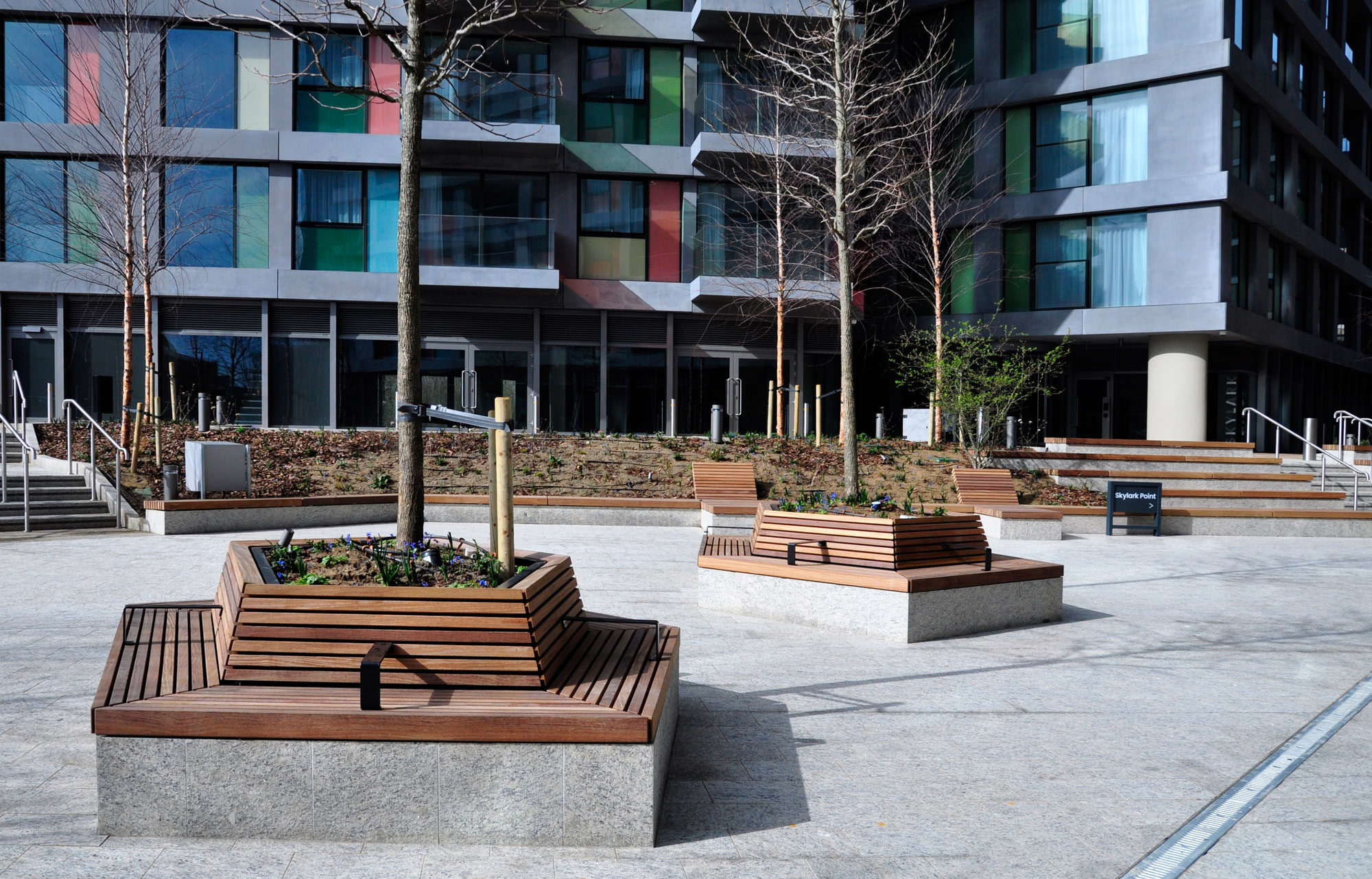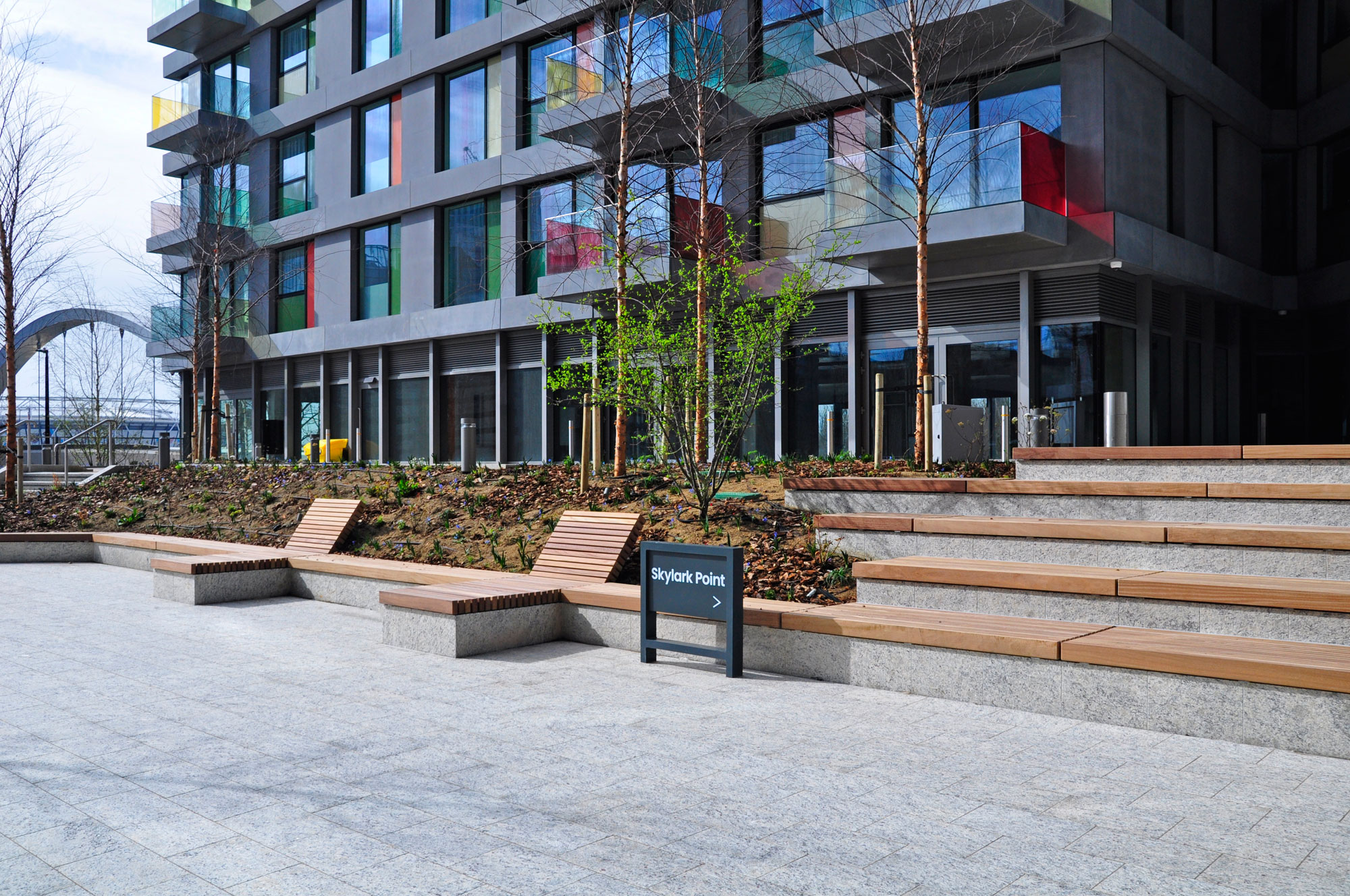 Our installation of street furniture at Ravens Walk in Stratford, London, shows just how much outdoor spaces can be transformed through creative design and the right mix of benches, planters and, in this instance, loungers and tiered seating steps. The natural warmth of the timber seats and colourful steel frames create a vibrant and inviting space to sit, relax, and watch the world go by.
