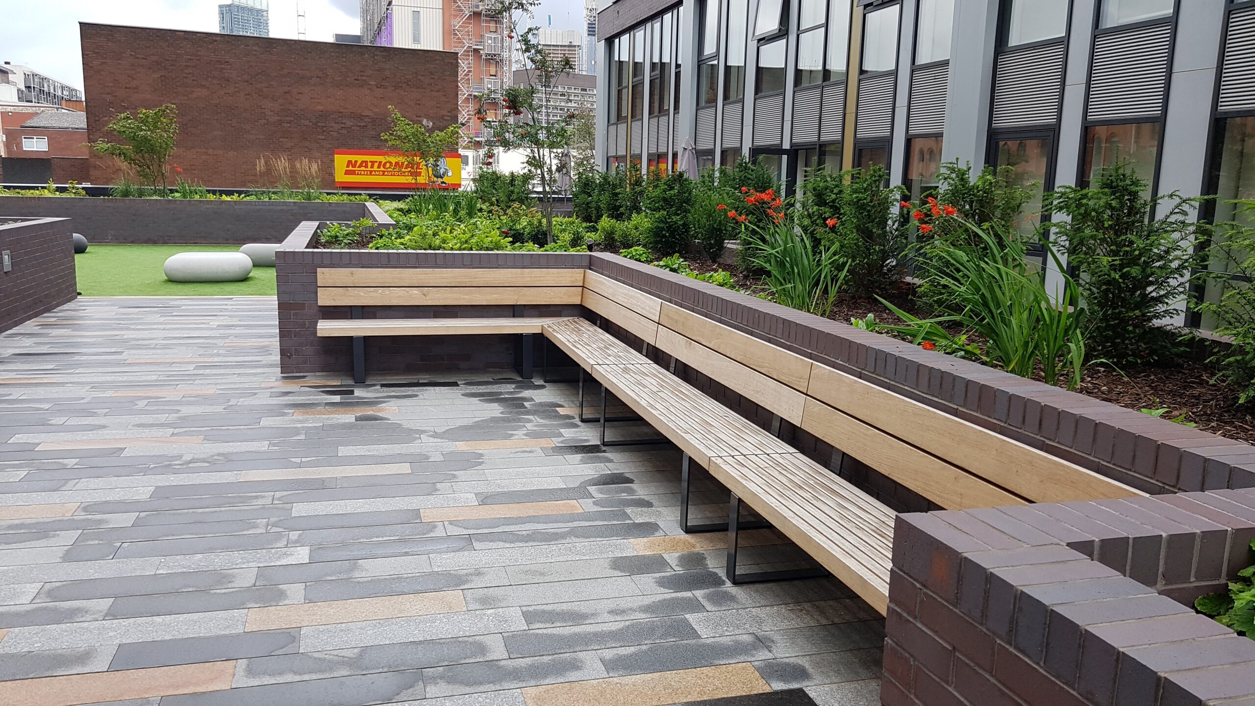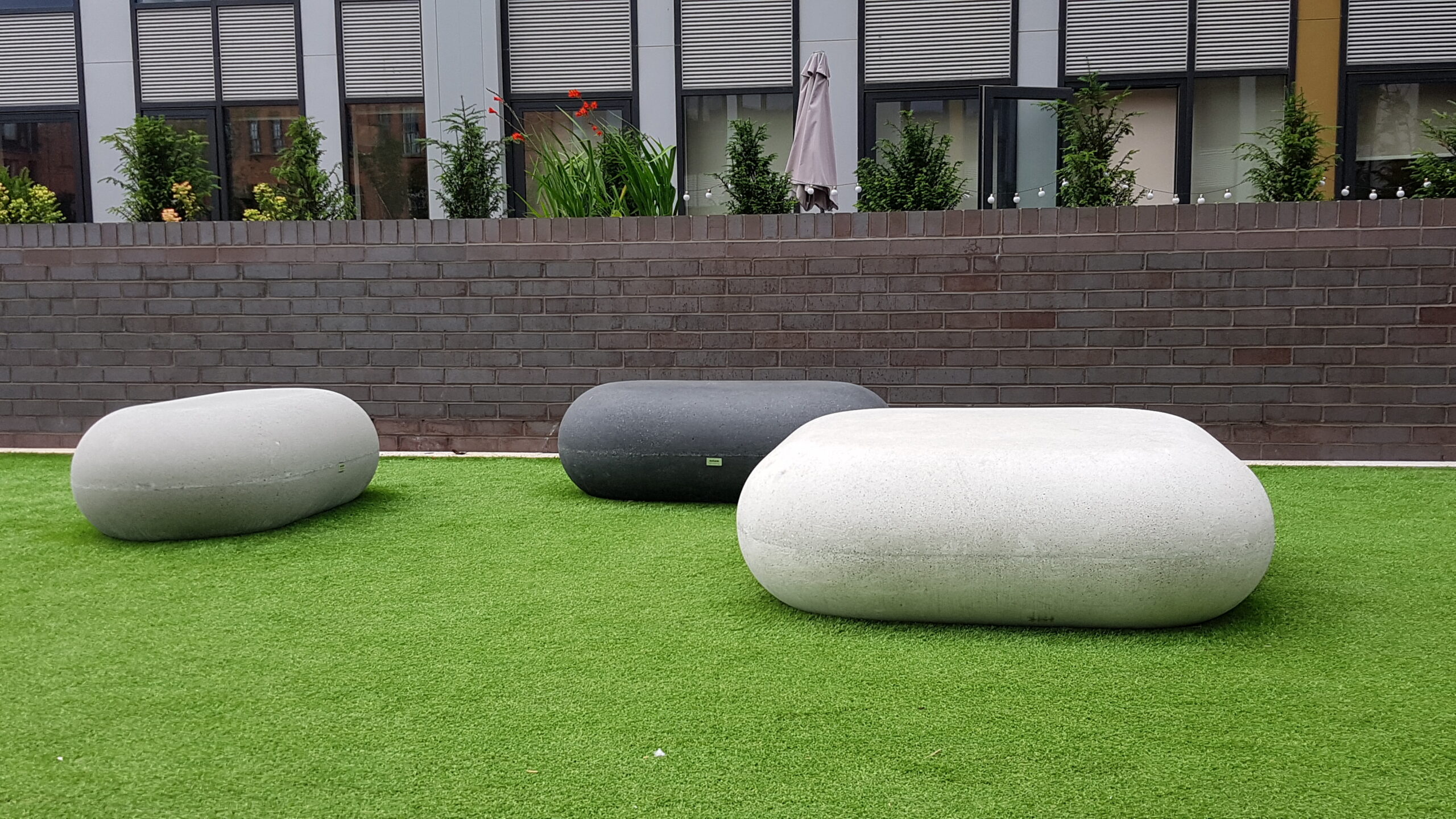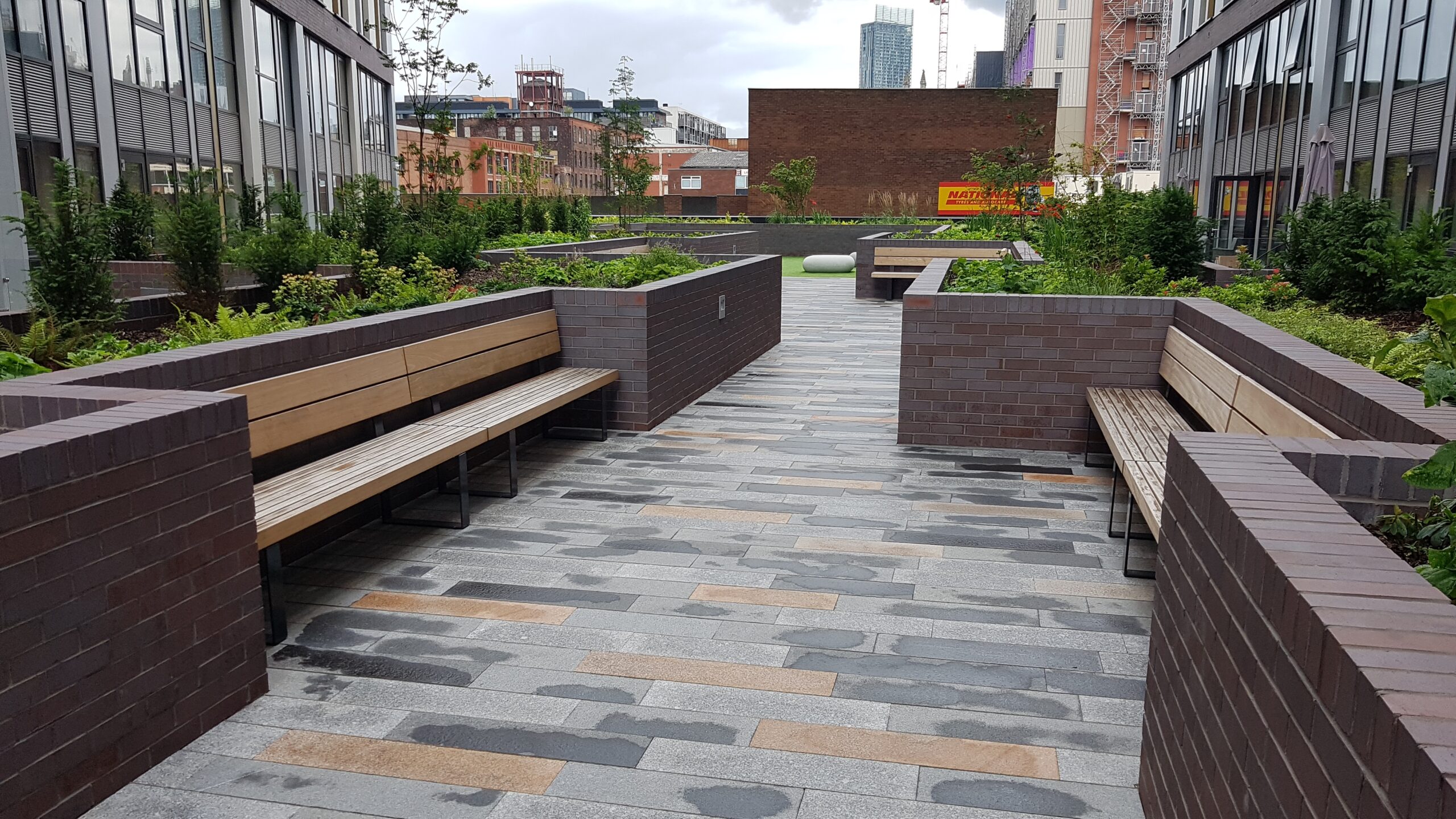 The Trilogy development in Ellesmere Street, Manchester, now benefits from landscaped communal grounds which were created with the residents’ different needs in mind, combining more formal seating with benches along the paved walkway which opens into a lawned area dotted with playful seating stones for informal get-togethers. Generously stocked planters frame the gardens, creating a peaceful space as an antidote to fast urban life, and inviting social interaction.