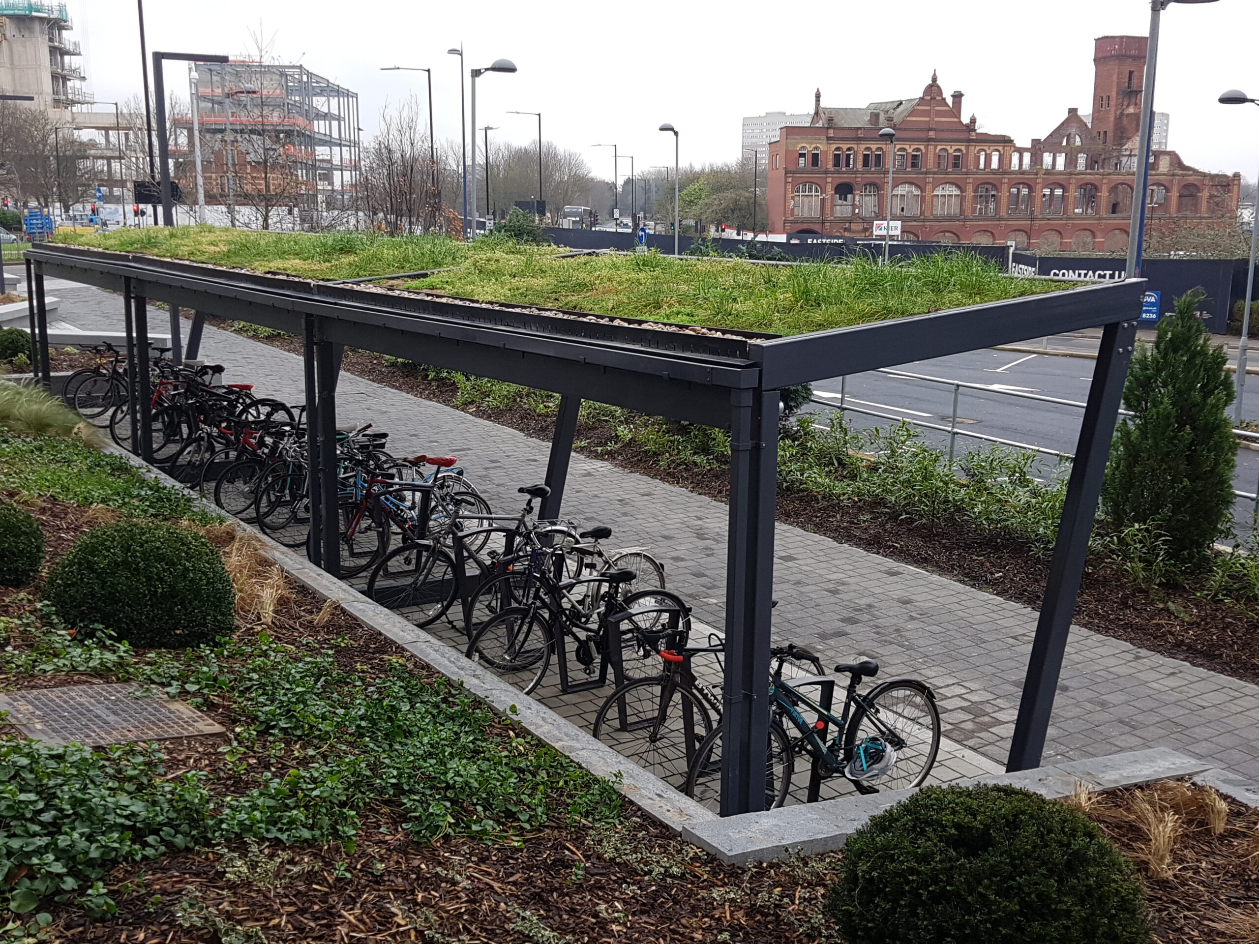 Birmingham City University are keen to lead the way with sustainable infrastructure on campus. As part of this initiative we recently installed a bespoke timber and steel cycle shelter that boasts a green roof planted with a pretty mix of native grasses and sedum. The plants will do a great job soaking up rainwater and helping to prevent flooding, contributing to CO2 capture and supporting local wildlife.