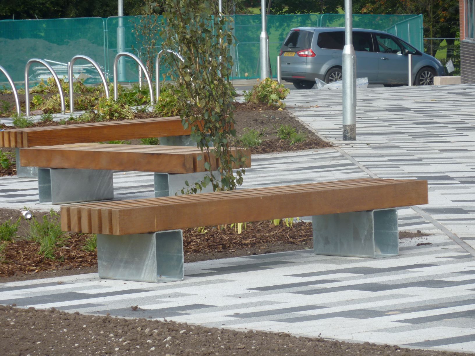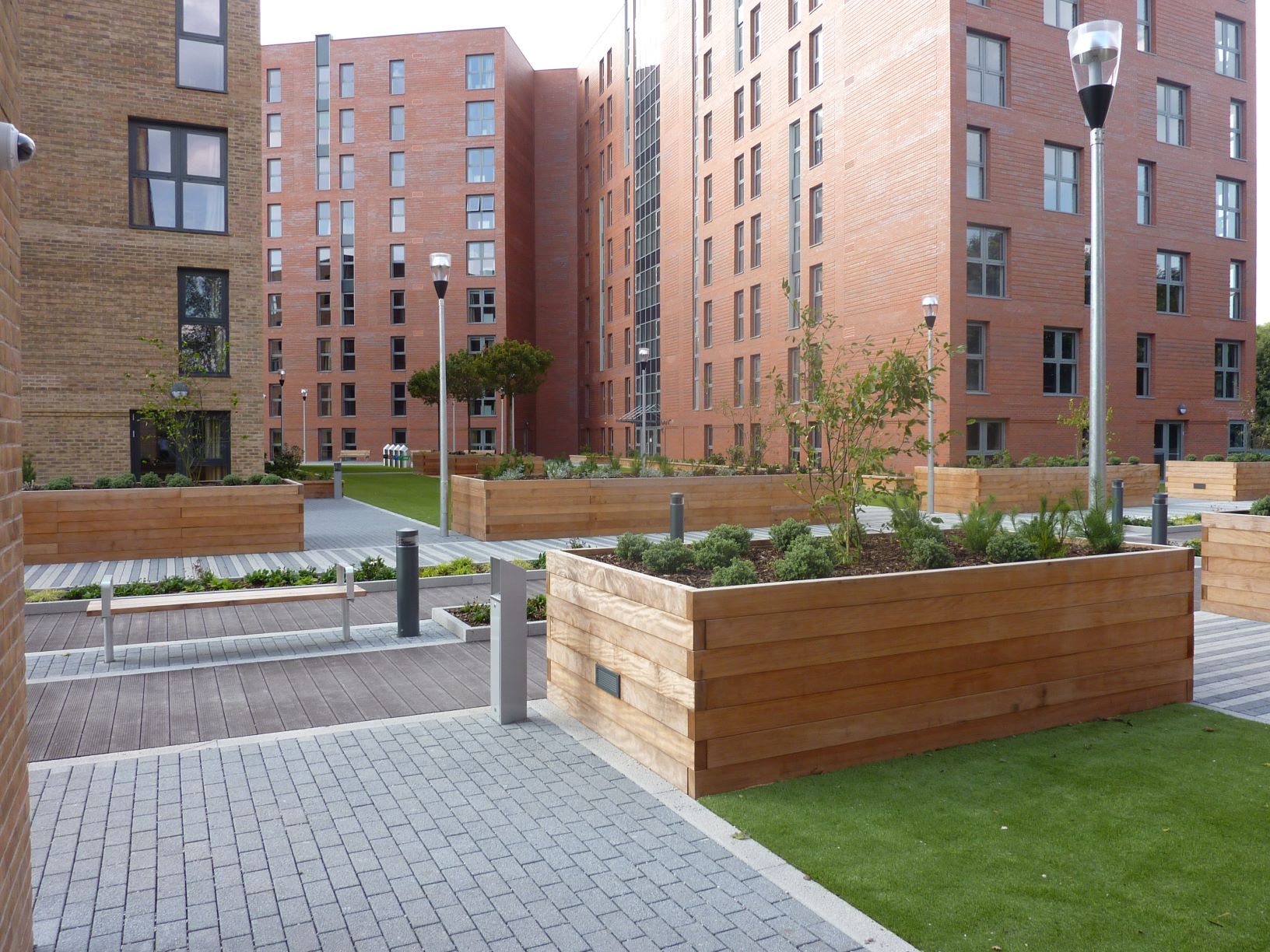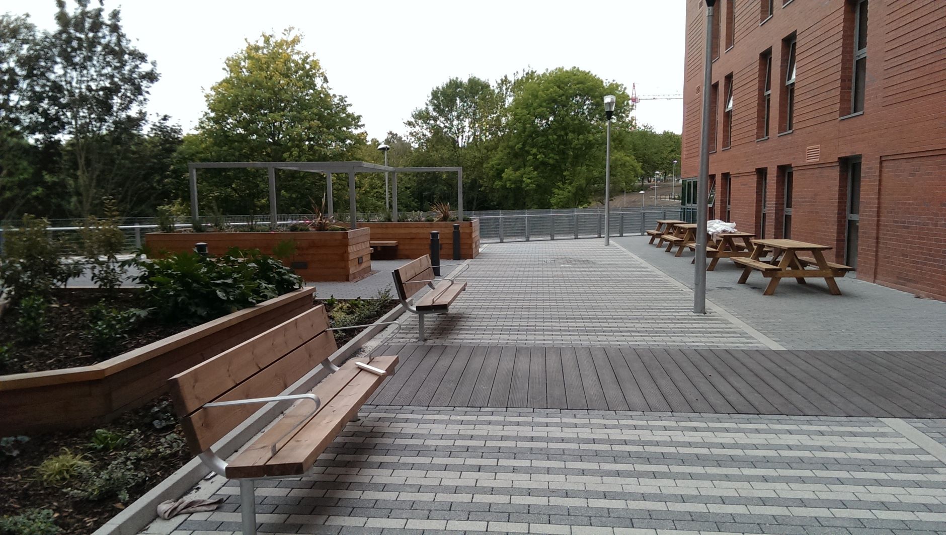 We were asked by Salford University to help create a campus that provides students with a natural and relaxing space to recharge, as well as encourage socialising. The bespoke street furniture scheme uses informal seating in timber and steel and timber planters of different sizes filled with plants and trees for maximum impact.